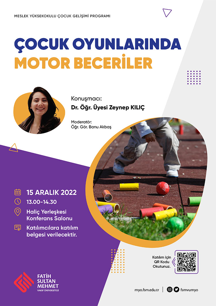 Çocuk Gelişimi Programı tarafından düzenlenen "Çocuk Oyunlarında Motor Beceriler" adlı seminer 15 Aralık 2022 Perşembe günü saat 13.00'te Haliç Yerleşkesi konferans salonunda gerçekleştirilecektir.