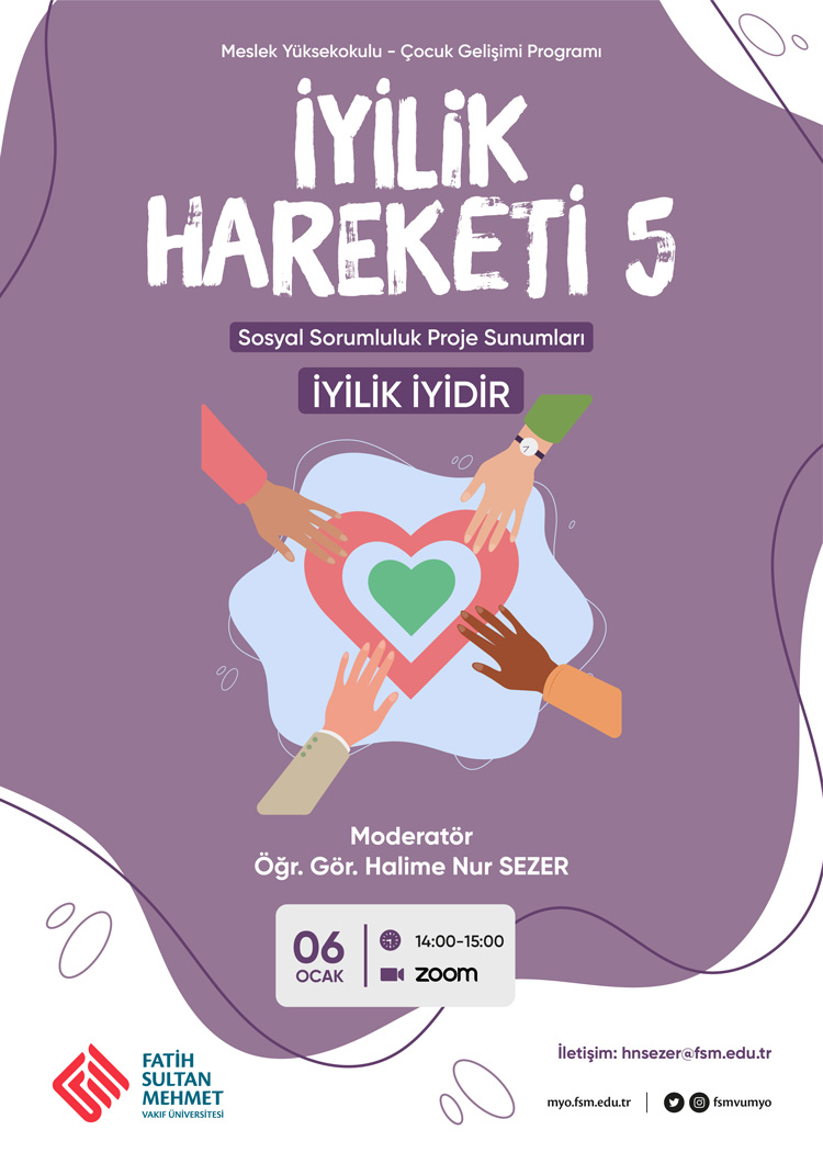 Çocuk Gelişimi Programı tarafından düzenlenen "İyilik Hareketi 5" adlı etkinlik 06 Ocak 2023 Cuma günü saat 14.00'te Zoom Meeting üzerinden gerçekleştirilecektir.
