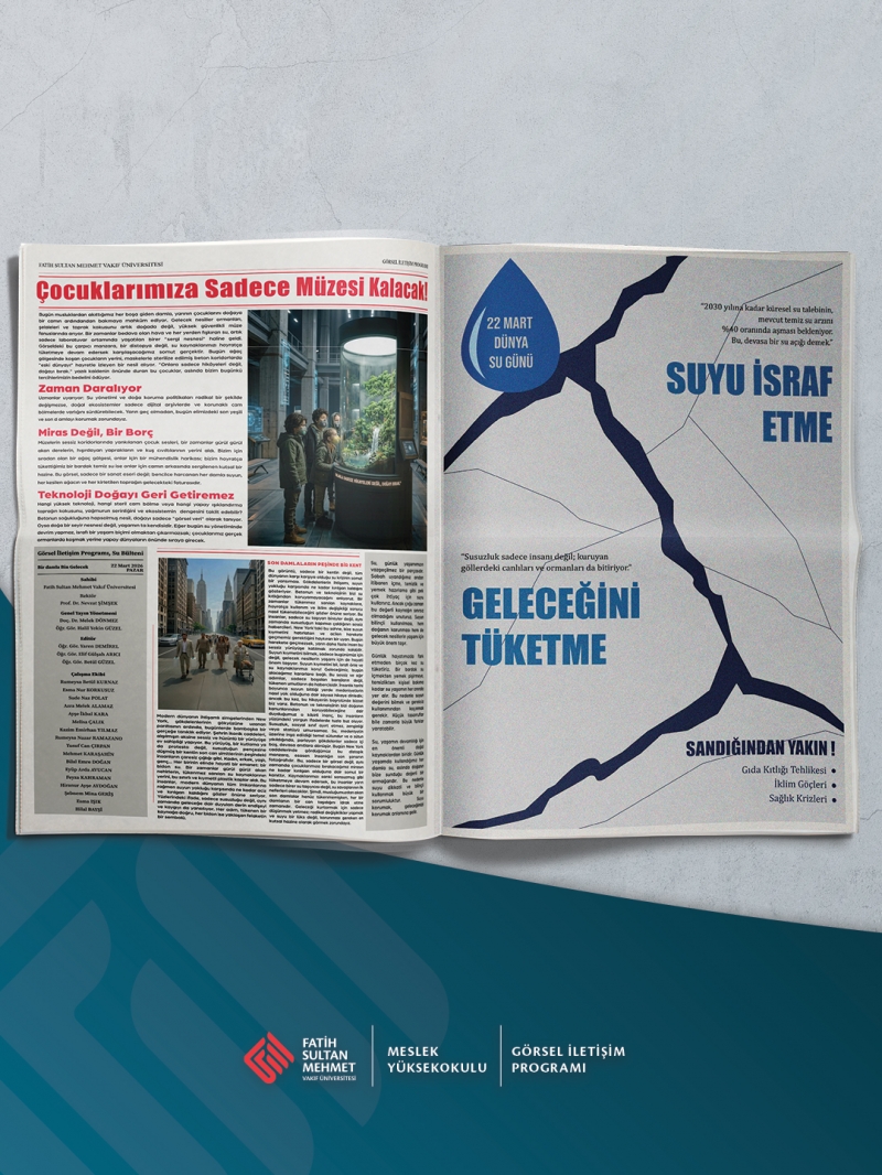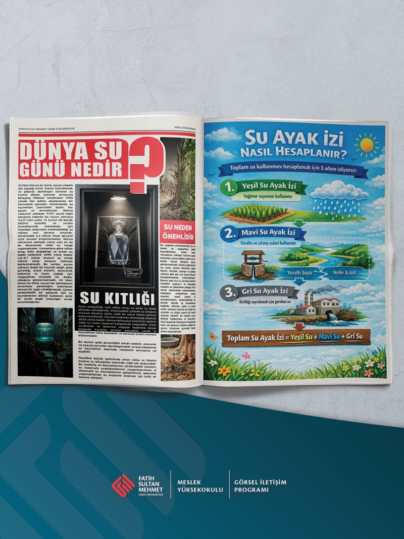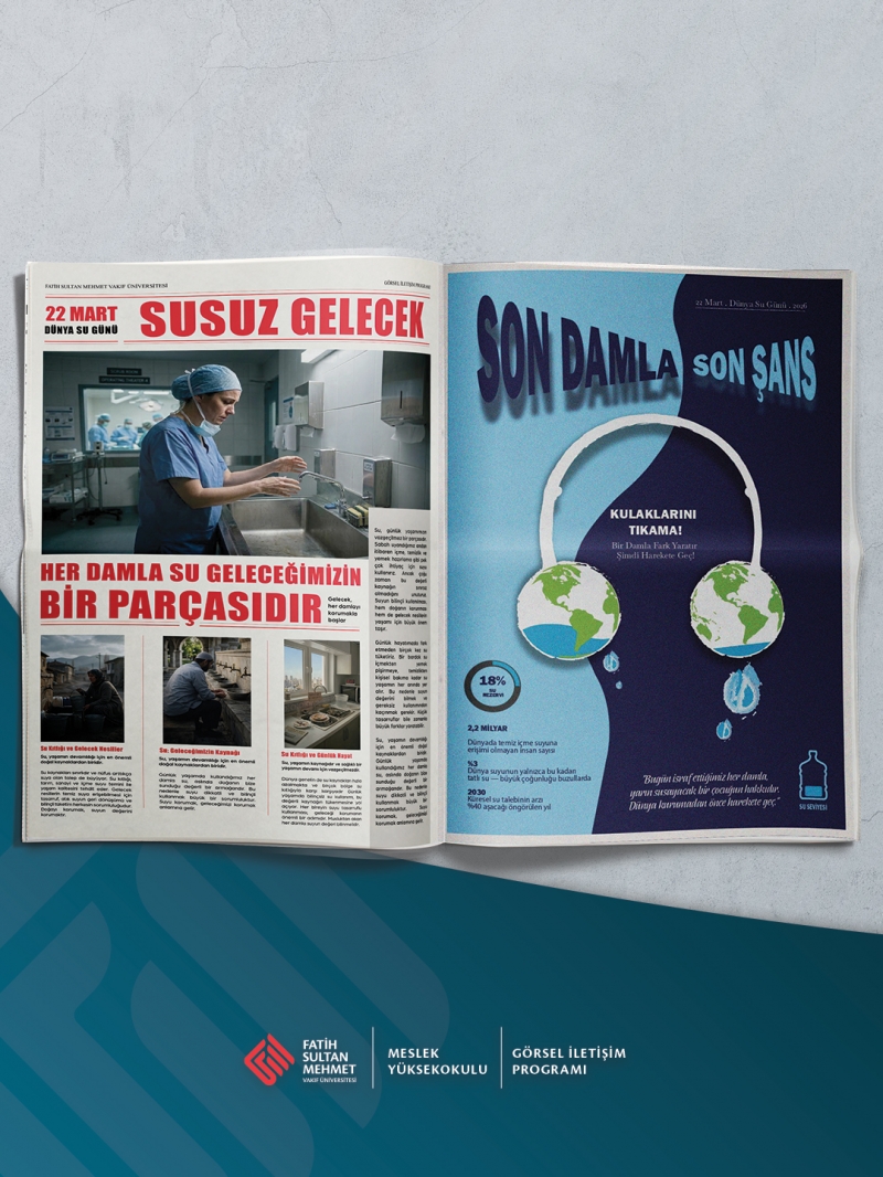Görsel İletişim Programı öğrencilerinin bakış açısıyla, suyun geleceğine dikkat çeken çalışmalarımızı hayata geçirdik. Sosyal sorumluluk bilinciyle hazırlanan “Su Bülteni” tasarımlarımızla, Dünya Su Günü’nde farkındalık oluşturduk. Daha yaşanabilir bir dünya için birlikte düşünmeye devam ediyoruz."