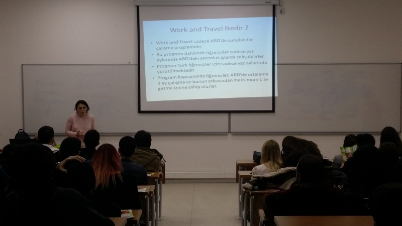 Seminerde Idealsas Yurtdışı Eğitim Danışmanlığı Şirketinden Eğitim Danışmanı Gökçe ÖZER öğrencilere Work and Travel, CampUSA ve yurtdışı dil kursları hakkında bilgiler verdi. Sunumda, İngilizcelerini geliştirmek amacıyla öğrencilerin farklı programlarla yurtdışına nasıl gidebilecekleri, öğrenciler açısından programların artıları - eksileri, konaklama imkânları gibi farklı konular hakkında bilgiler verildi. Konuşma, soru-cevap bölümüyle sonlandırıldı.