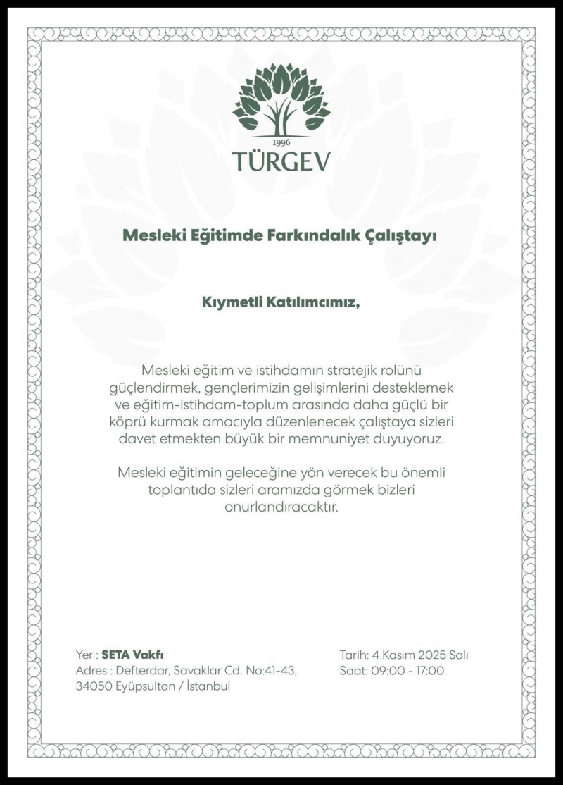 TÜRGEV 'in düzenlediği Mesleki eğitim ve istihdamın stratejik rolünü güçlendirmek, gençlerimizin gelişimlerini desteklemek ve eğitim-istihdam-toplum arasında daha güçlü bir köprü kurmak amacıyla düzenlenen çalıştay 4 Kasım 2025 tarihinde gerçekleştirilmiştir.