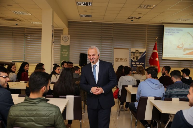 THY’nin tanıtım sunumuyla başlayan seminere Sivil Havacılık Kabin Hizmetleri Bölümü öğrencileri yoğun ilgi gösterdi. THY’nin dünya markası olma sürecini anlatan Temel Kotil, başarının çok çalışmak ve inanmakla elde edileceğini vurguladı. Seminer, öğrencilerin havacılıkla ilgili sorularının ardından Rektör Yardımcımız Prof. Ümit Doğay Arınç’ın hediye takdimiyle son buldu.