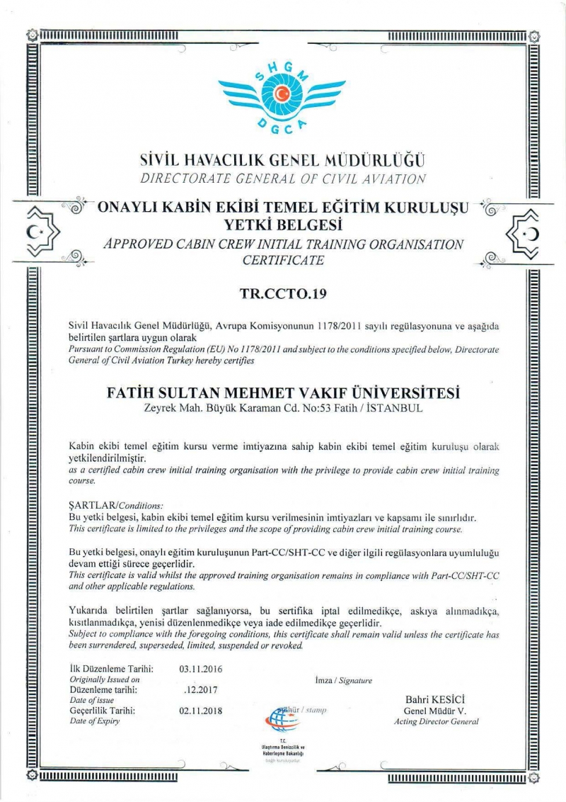 Üniversitemiz, 3 Kasım 2016 tarihinde Sivil Havacılık Genel Müdürlüğü'nden (SHGM) “Kabin Memuru Temel Emniyet Eğitimi Yetki Belgesi ve Cabin Crew Training Manual Onay Sertifikası” almaya hak kazanmıştır. Böylece Üniversitemiz SHGM onayına sahip dört üniversiteden biri olmuştur.