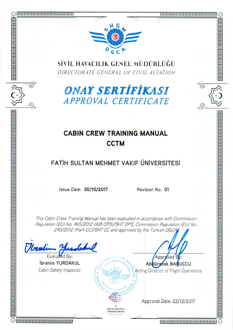 Havacılık sektörü, uçuş emniyeti ve güvenliğinin sağlanması adına hem ulusal hem de uluslararası düzenlemelere tabidir. Bu belge ile Sivil Havacılık Kabin Hizmetleri Programı bünyesinde verilen derslerin, Uluslararası Sivil Havacılık Örgütü (ICAO), Türkiye'nin de üyesi bulunduğu Havacılık Emniyeti Ajansı (EASA) ve Avrupa Sivil Havacılık Konferansı (ECAC) ile Ulaştırma Bakanlığı Sivil Havacılık düzenlemelerine uygunluğu onaylanmış olmaktadır.